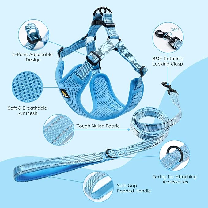 BELLA & PAL Adjustable Step-in Dog Harness, Puppy No-Pull Vest with Leash Set for XS/Small & Medium Dog, Breathable All-Weather Mesh, Reflective Strip, Secure Hook & Loop, Buckle Closure, Dual D-Rings