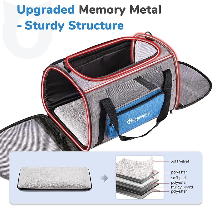 - Stable & Safe Frame: With upgraded memory metal for sturdy frame, this cat carrier for 2 cats does not collapse. Made of breathable fabric, BurgeonNest cat carrier has 3 doors to open, it is more convenient to put your dog cat in or out. Plush cushion with sturdy bottom inserts ensures comfortable environment for pets.