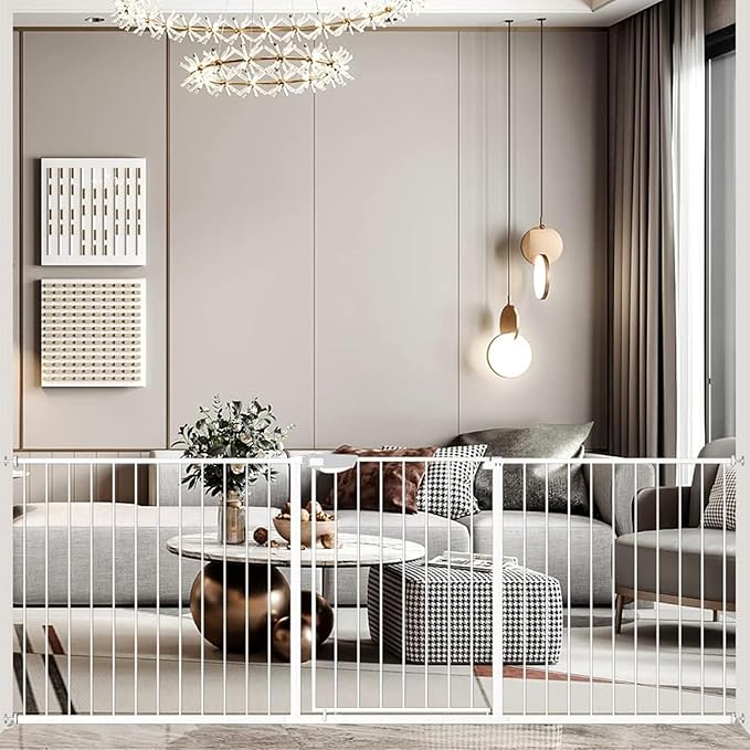- [Multiple Placement] Extra Wide Baby Gate Walk Thru Safety Gate stands 29.92 inches tall. It can expand to fit openings between 31 and 86 inches wide. We offer a wide range of sizes for you to choose from. The product contains different size of extension kits, with different combinations, suitable for many scenarios like stairs, doorways and so on. The specific accessories included in each size are shown in the pictures. Please be sure to measure the opening properly before purchase.