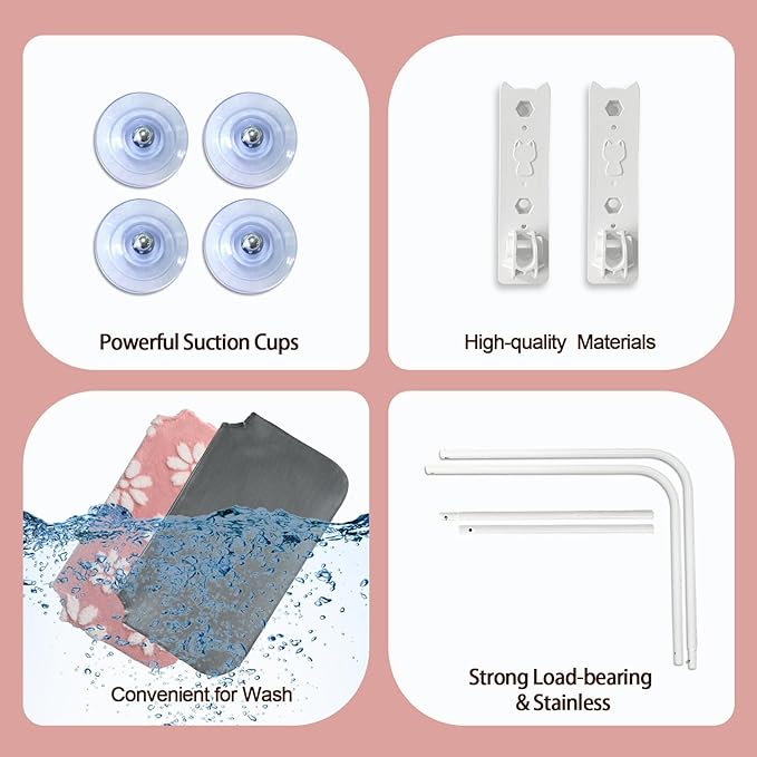 - Sturdy and Stable: The cat hammock is made of durable metal frame and cozy plush fabric, and can be fixed to the window glass through 4 suction cups. The large powerful suction cups make it sturdy and stable, with a load capacity of up to 40 pounds