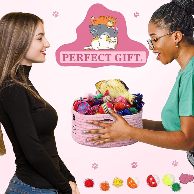 - A Good Choice: considering the variety, quantity and quality of toys in the set, this toy storage basket and set offers good value for money; A one time purchase can satisfy your cat's entertainment needs and storage needs for a long period of time, avoiding toys being randomly placed and lost, making it an ideal choice for cat owning families