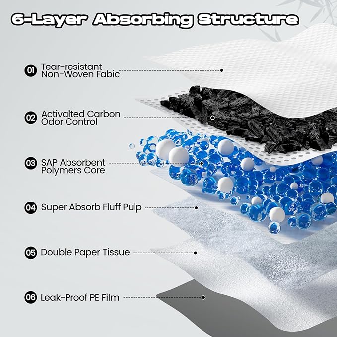 - 🦴【Super Absorbent & Quick Drying】6 layers of protection designed with polymers for super absorbency,converting liquid to gel in seconds for easy cleanup and staying dry.The non-woven fabric of the diaper pads accelerates liquid absorption and prevents reverse osmosis,keeping the surface dry quickly