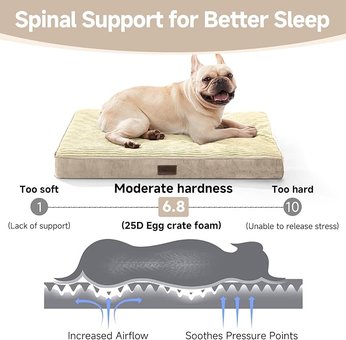 - 【Orthopedic Support】Engineered with high-resiliency 25D egg-crate foam, this bed delivers targeted orthopedic relief. It evenly distributes weight to alleviate strain on pressure points along the spine, hips, and joints—ideal for older dogs, large breeds, or pets with arthritis. Helps improve comfort and sleep quality.