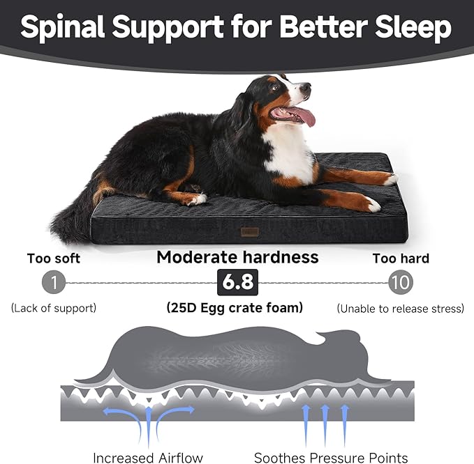 - 【Orthopedic Support】Engineered with high-resiliency 25D egg-crate foam, this bed delivers targeted orthopedic relief. It evenly distributes weight to alleviate strain on pressure points along the spine, hips, and joints—ideal for older dogs, large breeds, or pets with arthritis. Helps improve comfort and sleep quality.