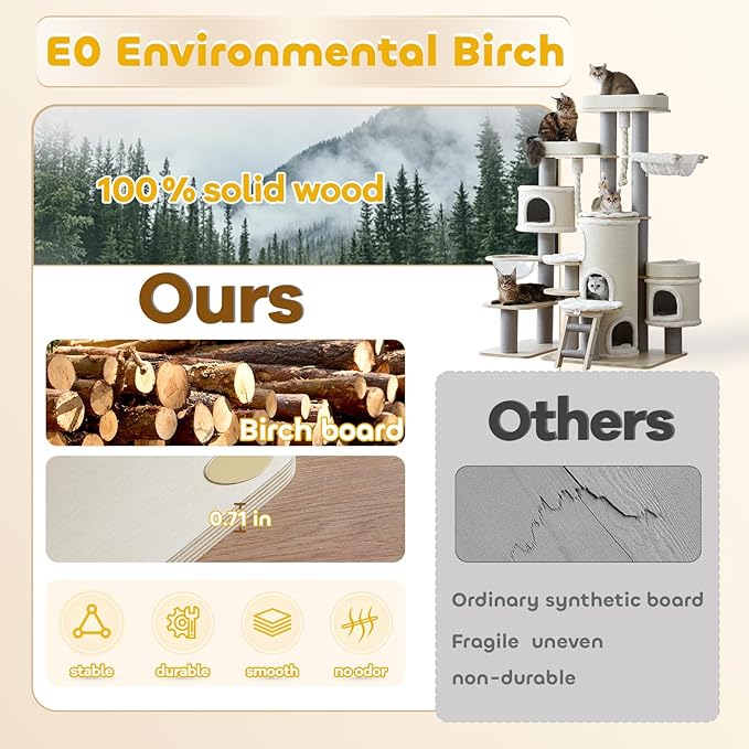 - SAFE AND STABLE: 48.82*27.56 inches large base with 0.7 inches thick wood boards, overall weight is 143.3 lbs, super heavy and won't wobble. The cat tree is made of E0 grade wood, no odor, safer. The board surface is flat and smooth, no burrs, won't hurt your family and cat's skin.made of E0 grade wood, no odor, safer. The surface of the board is flat and smooth, no burrs, won't hurt your family and cat's skin.