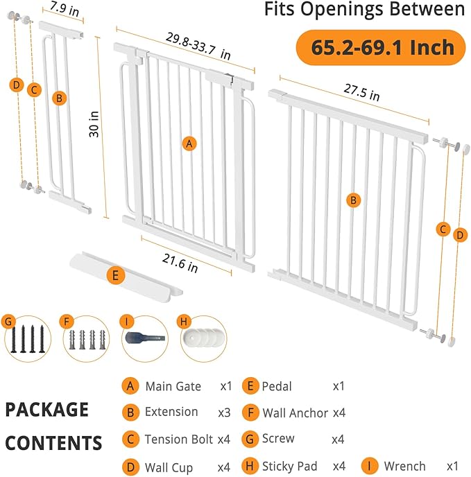 - Adjustable Baby Gate:Baby gates for dogs 30 inches tall, expands to fit openings 65.2-69.2 inches wide.21.6 inches swing door makes mothers easier to walk through while holding a baby.Please be sure measure your opening prior to purchase to ensure proper fit.