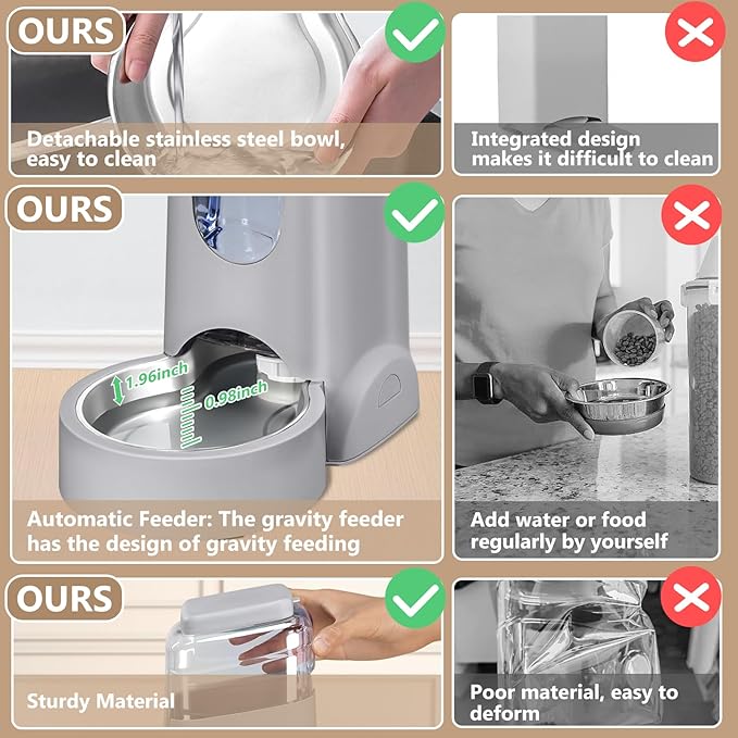 - Upgrading Materials of Pet Automatic Feeder: pet water dispenser made of safe, natural material. The bottom of the cat feeder has been upgraded with a movable stainless steel bowl to keep food fresher and easy to clean, not easily deformed, not rusty,sturdy and sanitary.