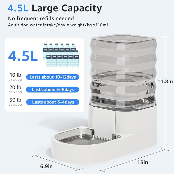 - 【More - 4.5L Dog Water Dispenser】4.5L pet water dispenser, can last 3-10 days for pets to drink according to their size. Even if you go out for a week, you don't have to worry about your pets without water. This pet waterer continues to provide your pet with high-quality water sources, free your steps, and make your travel worry-free.