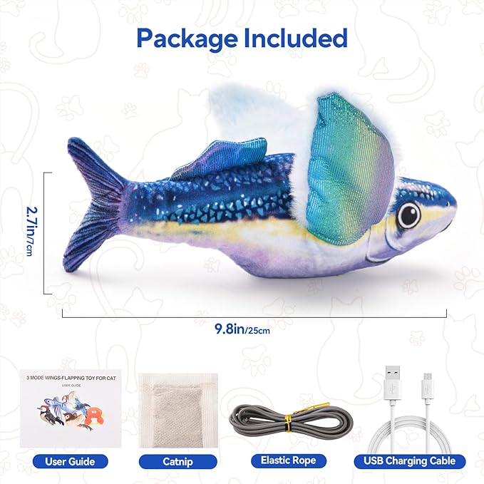 - 【Interactive Flapping Fish Cat Toy】: This is an electric cat toy designed in the shape of a fish, equipped with a built-in touch motion sensor. When your cat taps it, the chirping cat fish toy will automatically flap and make a sound, attracting your cat to play. Additionally, the toy comes with a hook and an elastic rope, allowing you to hang the fish toy. This can effectively engage your furry friend, helping to relieve their boredom and loneliness. (Note: This is a flapping toy that remains on the ground; it is not a flying toy.)