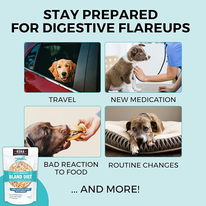 - NO COOKING NECESSARY: When your vet suggests feeding your dog a bland lamb and white rice diet, there's no need to waste time cooking. KOHA Bland Diet is convenient and ready-to-serve!