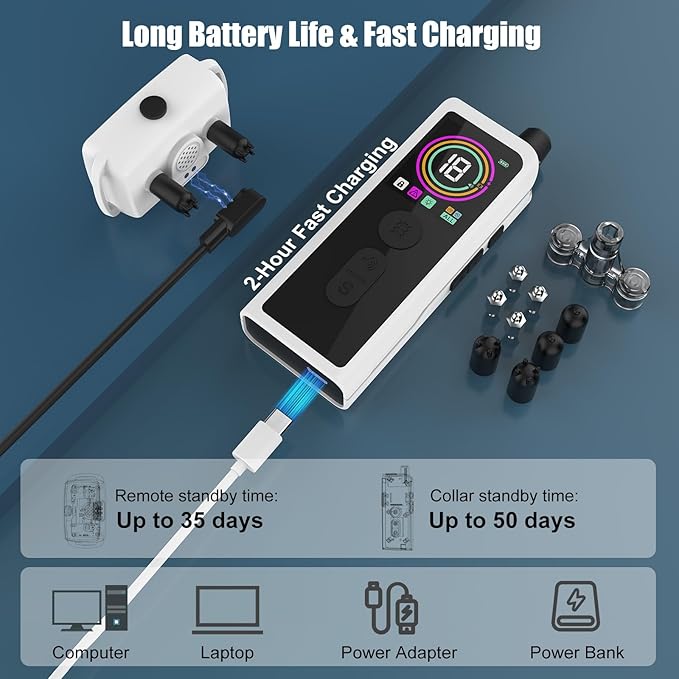 - Long-Lasting Battery with Easy Charging: The collar offers exceptional battery life. The LED screen displays battery levels for both the remote and collar. The 2-in-1 charger fully charges the collar in just 2 hours. The collar lasts up to 35 days on standby, and the remote lasts 50 days! Perfect for extended trips like camping or tailgating weekends, while also ensuring your dog stays safe and visible to prevent getting lost