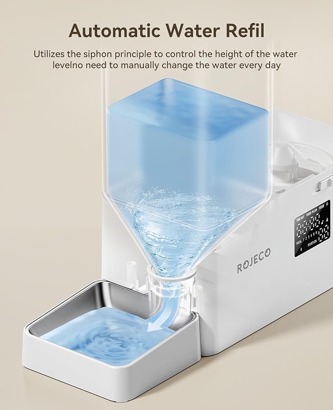 - 【2 in1 Feeder,Scientific Feeding】 2-in-1 Automatic Cat Dog feeder and Water Dispenser, separate feeding water feeder prevents wet food and prevents pets from eating moldy or wet food; 5L food + 3.5L water supports extended travel (2 cats up to 7 days), reducing the possibility of pets going hungry during travel/overtime.