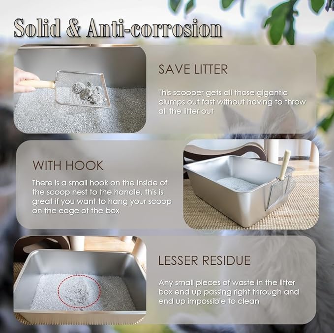 - Durable Beech Handle - It is a wrist-friendly scoop for it offers an ergonomic handle which is made of beech to avoid bending, breaking or flicking as you scoop cat litter from feline litter boxes