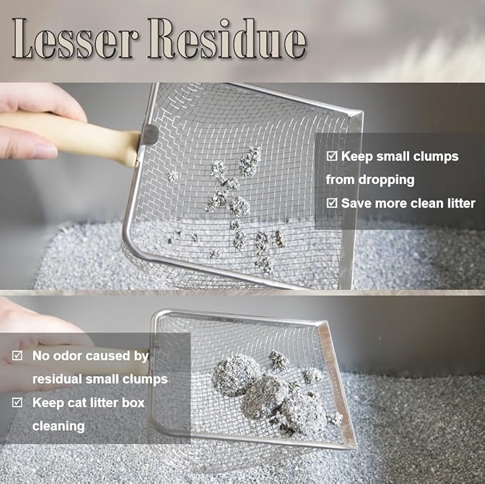 - Wider Surface and Larger Scooper - The Vitisyao cat litter scoop is much wider and larger than other wire material mesh scoop on the market. You don't have to squat next to the litter box for half a day to pick up the small falling debris