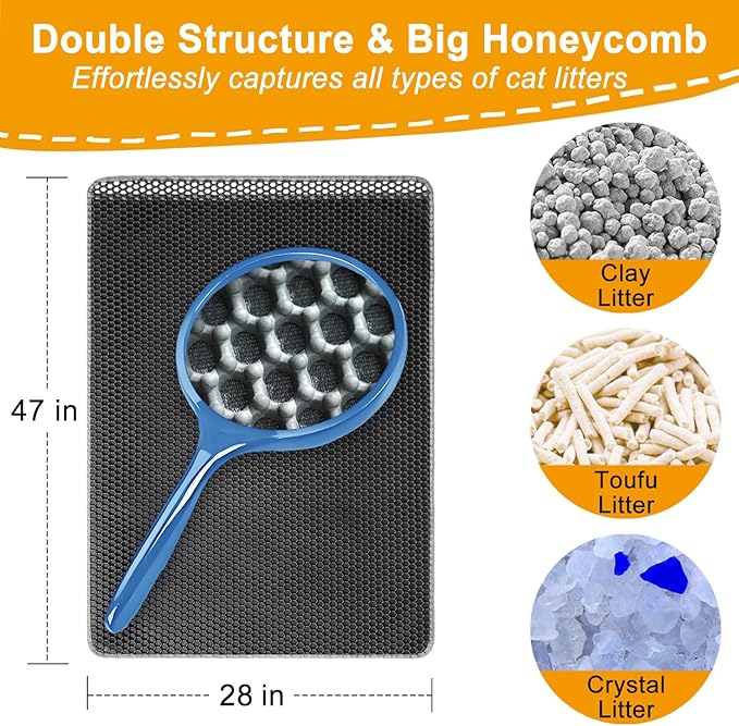 - Extra Large Dual Layer Design:Extra-large honeycomb surface traps litter effectively + waterproof base with anti-slip texture. Specifically designed for XL 47"x28" litter boxes and multiple-cat households.