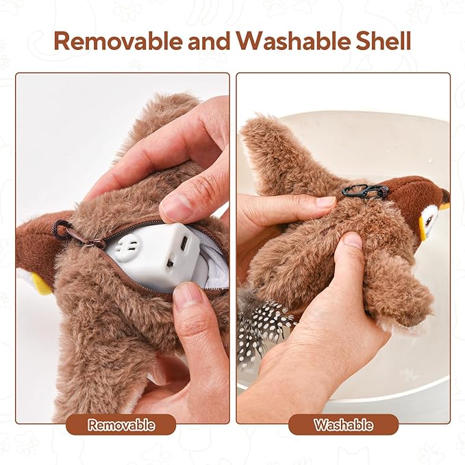 - 【Safe Material & Easy to Clean】:Crafted with soft, durable plush and multi-textured feathers, the flapping bird toy for cats withstands rough play while being gentle on paws, and the reinforced stitching ensures long-lasting use for daily interactive play. The fully detachable mechanism enables you easily remove and wipe down the plush body, making it convenient to clean.