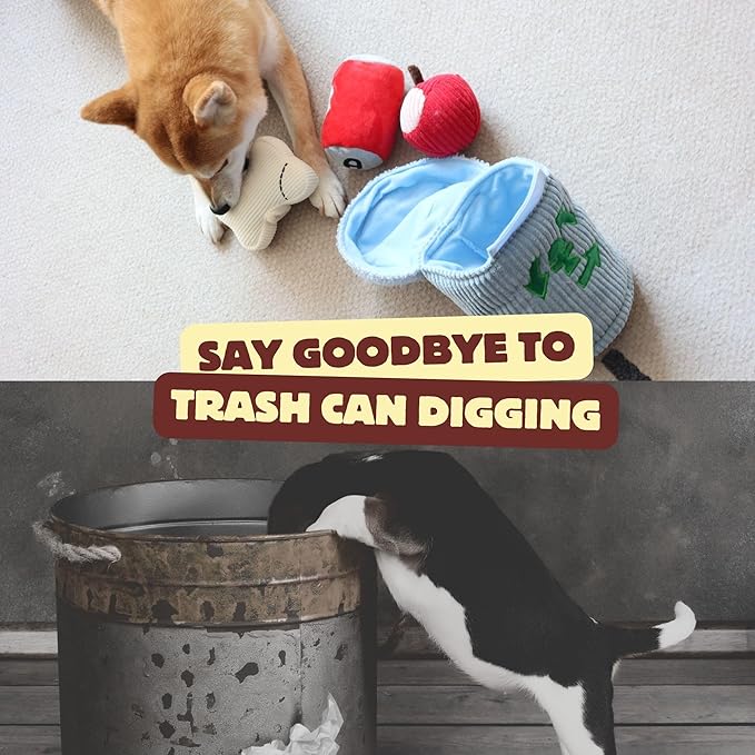 - 🎾【4-in-1 Interactive Play】This interactive dog toys with squeaker includes a plush trash can and 3 surprise toys for endless entertainment. They can attract puppy's attention and avoid them from damaging furniture and other home items.