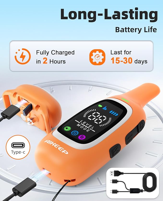 - Fast Charging & Long Battery Life – with a high-capacity rechargeable battery, the dog shock collar receiver lasts 15+ days and the remote lasts 30+ days on a single 2-hour charge.