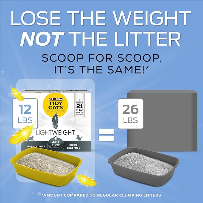 - LIGHTER CAT LITTER: Tidy Cats cat litter lightweight formula is 50 percent lighter than the leading clumping litter--less weight, not less litter.