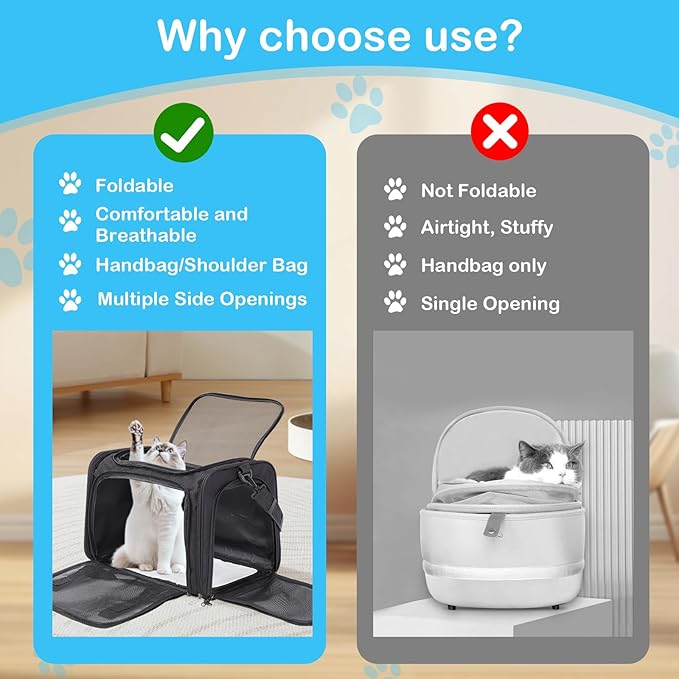 - Easy to Clean & Store: The cat carrier bag features a removable, machine-washable mat, making it easy to keep clean. The collapsible design allows soft pet carrier to fold flat for compact storage when not in use, saving space in your home or vehicle.