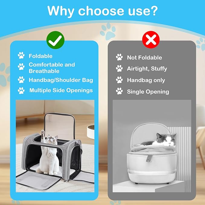 - Easy to Clean & Store: The cat carrier bag features a removable, machine-washable mat, making it easy to keep clean. The collapsible design allows soft pet carrier to fold flat for compact storage when not in use, saving space in your home or vehicle.