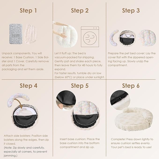 - QUICK FLUFF & RECOVERY: This dog bed for small dogs is vacuum-packed for shipping. After opening, simply pat, shake, and let it sit for 48 hours to fully fluff up. For quicker results, tumble dry on low (under 60ยฐC), or leave it in the sun.