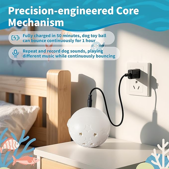 - [Rechargeable Dog Toy Ball]: Equipped with a USB charging cable, this automatic puppy interactive toy in 50 minutes for up to an hour of continuous vibration. Featuring a precision-engineered core mechanism designed for long-lasting durability. Easy to use: press the power button to activate the rolling ball, enter recording mode to capture and playback sounds, gently tap the dog toy to switch into musical rolling mode with rhythmic vibrations.