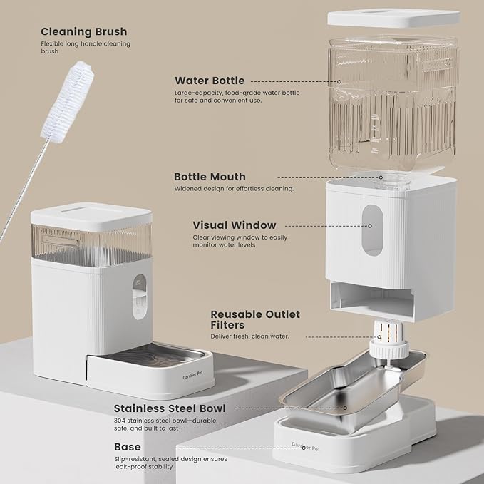 - Premium Pet-Safe Materials - Gardner Pert dog water bowl dispenser comes with 304 stainless steel bowl + cleaning brush guarantees a safe, easy-to-clean water supply for pets.