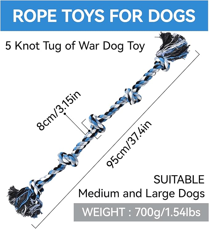 Dog Rope Toy 37.4 in, 6 Knots Dog Tug of War Toys for Aggressive Chewers, Indestructible Rope Toys for Medium Large Dogs, Blue-White