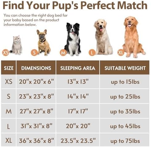- Suitable Size: Five sizes cat and dog cushion bed are available for your choice. We recommend a 20-inch dog bed for small dogs (up to 15 pounds), a 23-inch dog round bed (up to 25 pounds), a 27-inch dog round bed (up to 35 pounds), a 31-inch dog round bed (up to 45 pounds), and a 36-inch dog calming bed (up to 75 pounds)
