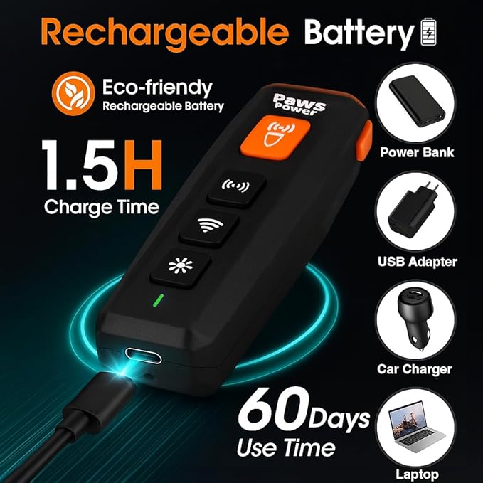 - [USB-C Rechargeable with Long Battery Life]: No more buying batteries! This anti barking device features a built-in 1000mAh battery that fully charges in just 1.5 hours and lasts up to 60 days on a single charge. It’s USB-C compatible, so you can recharge it using a laptop, power bank, or car adapter—perfect for travel, daily walks, or home use. It’s a sustainable, low-maintenance alternative to traditional dog bark collars.
