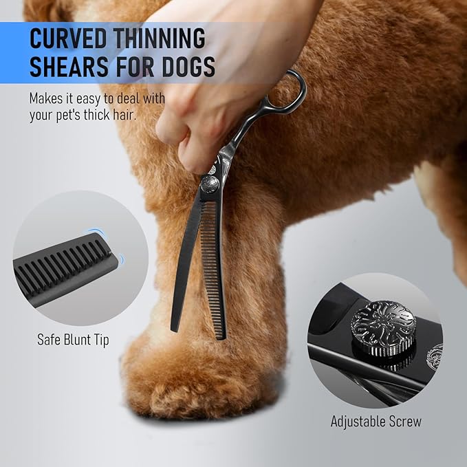 - Adjustable Tension for Customized Cutting Each scissor in the set—straight, curved, and thinning/chunkers shears—comes with a manual tension screw, letting you easily adjust the blade tightness for optimal performance. No more stuck blades or uneven cuts; just seamless grooming tailored to your preference