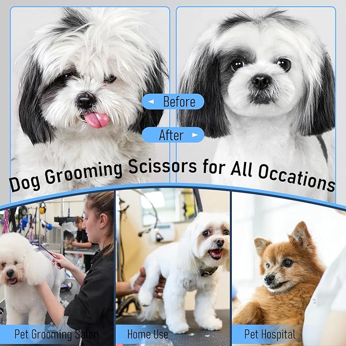 - Complete Dog Grooming Scissors Kit with Stylish Storage This all-inclusive set features four professional scissors (straight, curved up/down, curved thinning shears), a detangling comb, and a sleek for organized portability. Whether at home or on the go, you’ll have the right tool for every grooming need