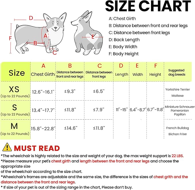 - 【Fully Adjustable Fit for All Sizes】 This dog wheelchair for back legs features a fully adjustable frame—refer to the SIZE CHART to ensure the perfect fit. Designed to support dogs of all sizes, the expandable structure adapts to your pet’s growth, while the lightweight build ensures lasting comfort. A dependable wheelchair for dogs facing mobility challenges.