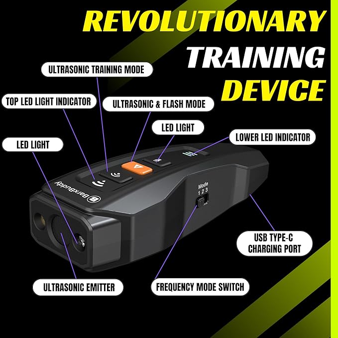 - Enhanced Battery for Reliable Training - Our bark stopper features a 1200mAh built-in battery, providing up to 60-days use on a quick 2-hour charge. Functions similar to a dog whistle to stop barking neighbors dog, and deterrent strobe flash assist in managing aggressive behavior, making BarksBuddy’s stop barking device the right choice for training small, medium and large dog breeds.