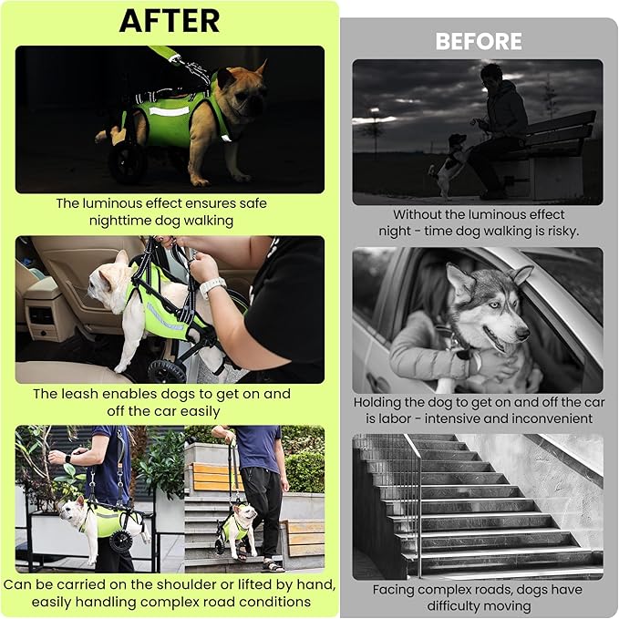 - 【High Visibility & Potty-Friendly Design】 Featuring a reflective safety vest and leash, this wheelchair for dogs improves visibility during low-light walks. Its open-back frame design allows your dog to go potty naturally without needing to remove the device.