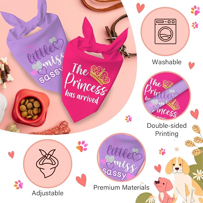 - Unique & Playful Design: These dog bandanas with sassy and princess designs is double-sided printing. The dog bandana up to 18.1x18.1x24.8 inches, ensures comfort for small medium pet dogs' neck sizes. Whether it's Christmas or birthday, these puppy bandanas are a perfect gift