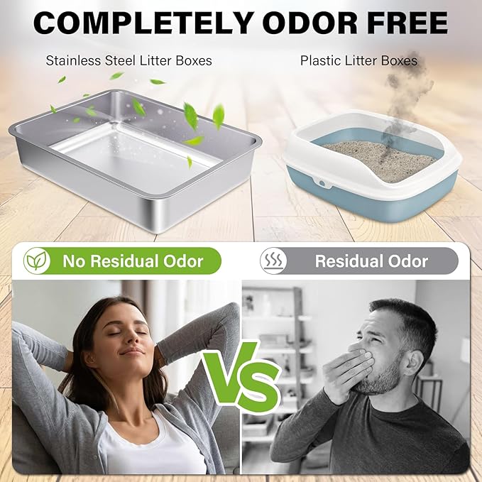 - The small stainless steel litter box doesn't retain unpleasant odors. The smooth surface of the metal litter box is comfortable to the touch for both you and your cats.