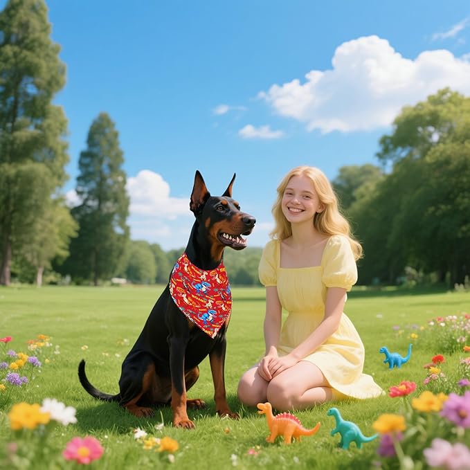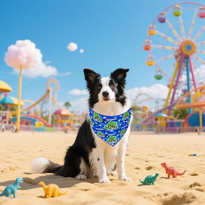 - Dinosaurs bandanas material: polyester,breathable,soft and reversible;hemming seam edge stitching,sturdy and durable;can folded, easy to store and carry;can adjust the length according pet neck circumference