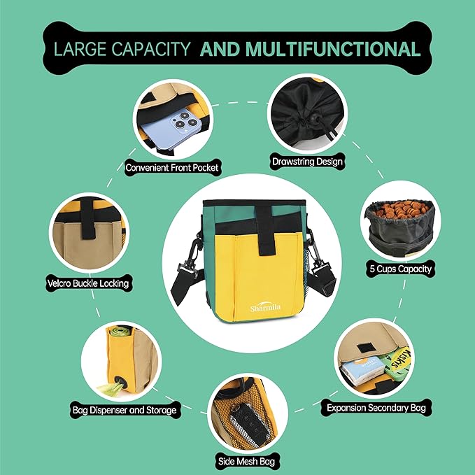 Sharmila Dog Treat Pouch - Large Capacity Storage & Multi-Pocket Design, Waterproof Training Treat Pouch Constructed from High-Density Oxford Fabric for Pet Training, Dog Walking, Hiking (Yellow)