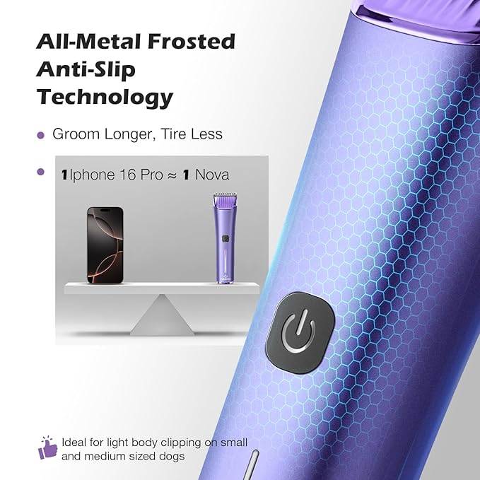 - 【Ergonomic Metal Grip Design】 The full-metal frosted body provides anti-slip grip,professional durability and balanced weight to reduce hand fatigue during long sessions. Heavy-duty guide combs work across all coat types and body zones—from light cat grooming to precisise trimming on large dogs and horses.