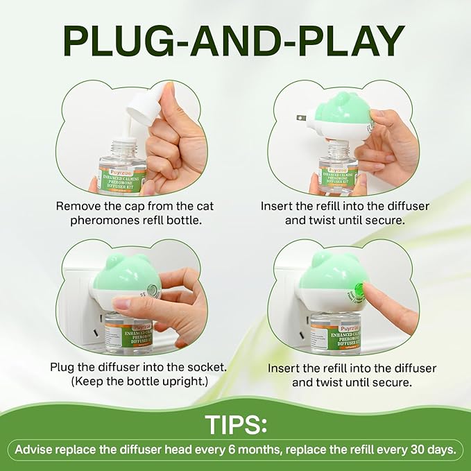 - GENTLE STRESS RELIEF FOR CATS: Puyrzoe cat calming diffuser releases a gentle pheromone-inspired formula to help ease common stress-related behaviors in cats, such as scratching, urine marking, hiding, or tension in multi-cat homes. Whether it’s a new environment, loud noises, or separation from owners, this cat calming diffuser helps create a more peaceful and relaxed living space for your feline companions.