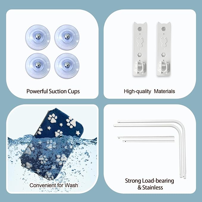 - Sturdy and Stable: The cat hammock is made of durable metal frame and cozy plush fabric, and can be fixed to the window glass through 4 suction cups. The large powerful suction cups make it sturdy and stable, with a load capacity of up to 40 pounds