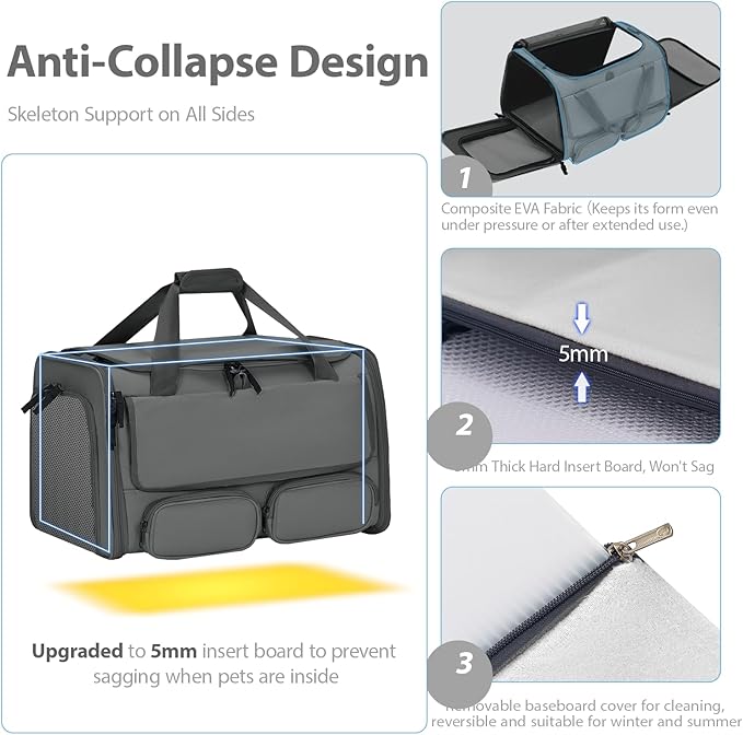 - [Anti-Collapse Structure for Stability]: Built with a 5mm thick hard base insert and EVA frame, the carrier stays firm and stable without sagging. Ensures pets always have a solid, comfortable space to rest.
