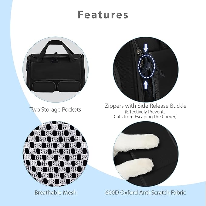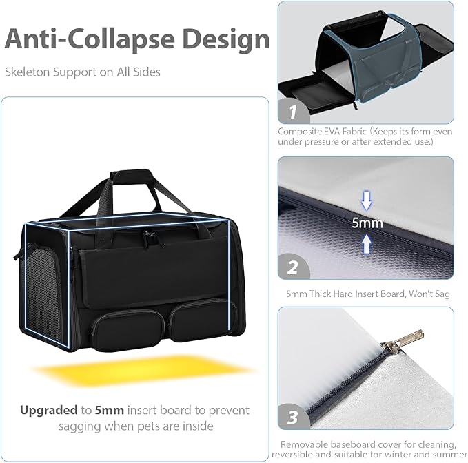 - [Upgraded No-Sag Base & Premium Fabric]: Crafted from durable 600D Oxford fabric and high-strength EVA material, our cat carrier holds its shape even under pressure or extended use. The upgraded 5mm insert board provides extra support, allowing your pet to stand comfortably without the base sagging.