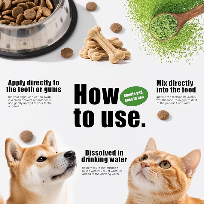 - CUSTOMIZED FOR ALL DOGS & MULTI-PET HOMES : Precisely dosed for dogs 4lbs–100lbs+, with perilla seed extract to soothe senior dogs’ gums and prevent puppy plaque. Our dog dental powder is gentle enough for cat teeth cleaning, offering versatile dogs teeth care for households with multiple pets. Adjustable dosing ensures perfect oral care for every size and age