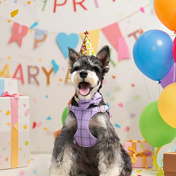 Beirui Cute Small Dog Harness Collar and Leash Set with Bowtie, Soft Adjustable Plaid Puppy Harness for Small Sized Dogs Cats Walks Parties and Photoshoots(Purple,S:Chest 17-23")