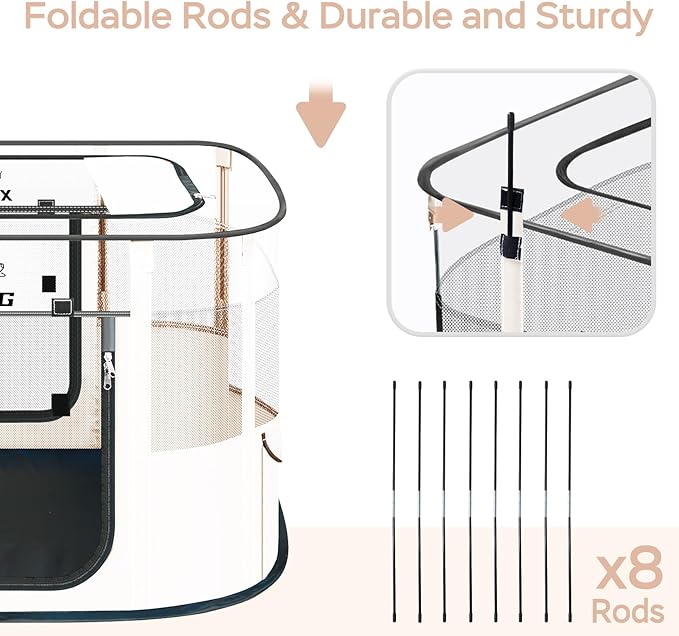 - 【Breathable&Comfortable】:High density breathable mesh design ensures air circulation, keeping pets cool and comfortable inside the fence. The fabric is durable and scratch resistant, while providing a good view, so that pets will not feel oppressed, and owners can also observe their pets' condition at any time