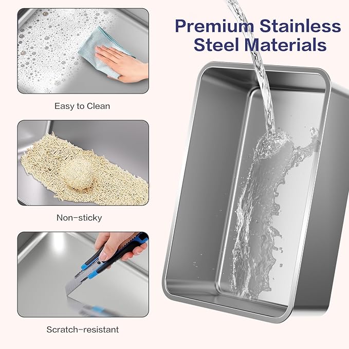 - 【18IN High Side Leak-Proof Design】: The jumbo stainless steel kitty litter box adopts a 6-inch high side shell and a 6-inch top cover. The steel cat litter box prevents urine leakage through upgraded buckles and overlapping design without seeping from the seams. It is very suitable for cats who pee while standing or like to dig holes. No need to worry about urine splashing and dirtying the ground, and no odor leakage, it is an ideal choice for the family