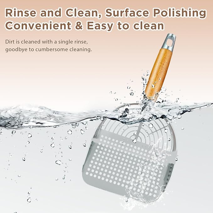 - 5-Second Non-Stick Cleanup – Stainless steel litter scoop’s polished surface prevents litter from clogging, repelling even sticky mud. Rinse without scrubbing and store via holder or hook—no residue after cat poop scooping!